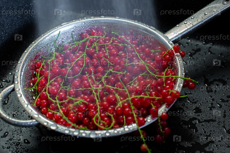 Красная смородина в дуршлаге под струей воды