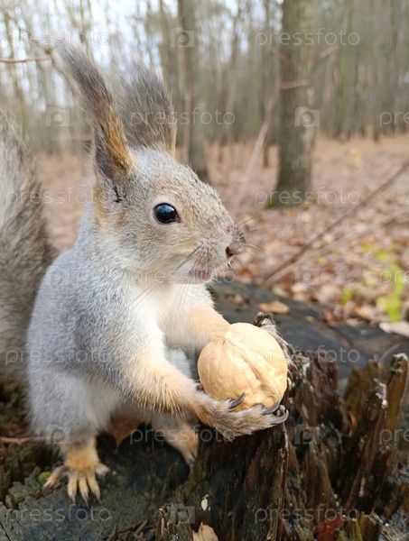 Белка в зимней шубке на пеньке крупным планом забавно держит лапками большой грецкий орех и весело смотрит на тебя