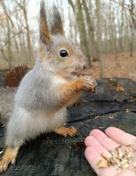 Белка в зимней шубке сидит на пенке и завораживающе смотрит прямо в глаза, взяв орех с руки