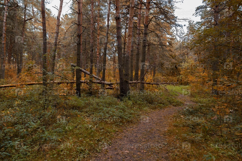 Упавшее дерево среди сосен осенью