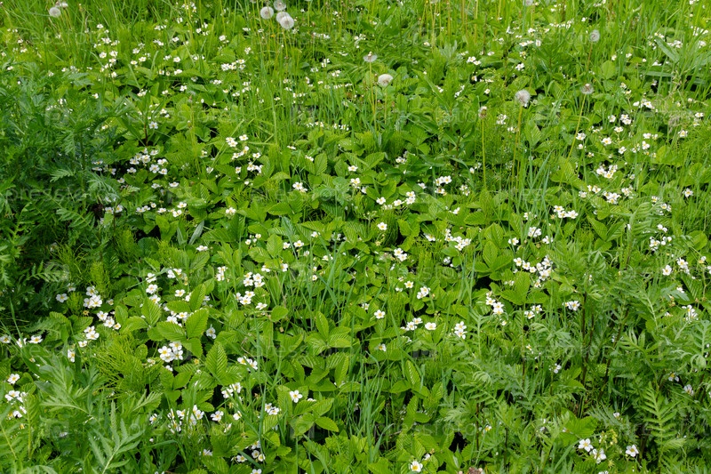 Поляна цветущей клубники на лугу