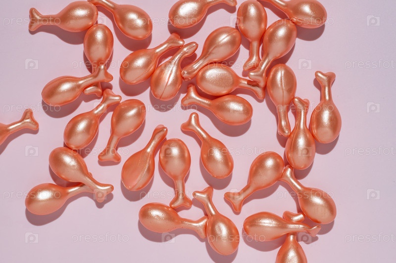 Капсулы с кремом или сывороткой для ухода за лицом на розовом фоне. Одноразовые капсулы для косметического ухода. пептиды коллагена или гиалуроновая кислота. Уход за кожей в минимальном стиле