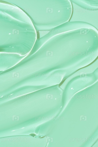 Косметические мазки кремовой текстуры на зеленом фоне. Капли косметической сыворотки. Прозрачный и кремовый образец средства по уходу за кожей