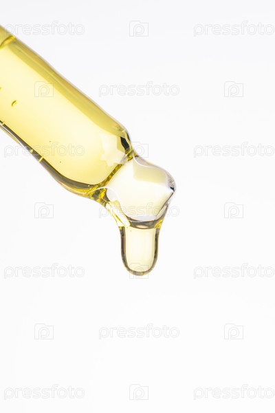Косметическая пипетка с желтой маслянистой каплей крупным планом на белом фоне, макрос