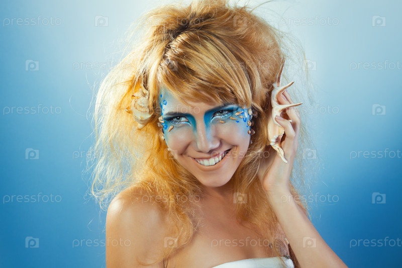 Красивая девушка с морской раковиной у уха