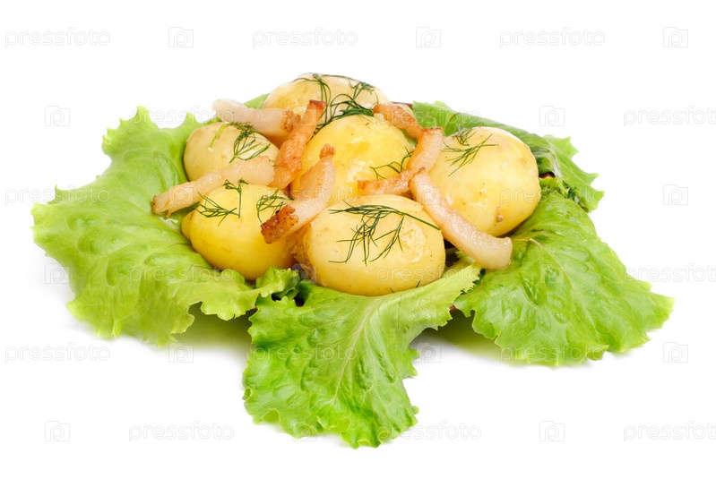Молодой картофель и зеленый салат, изолированные на белом фоне