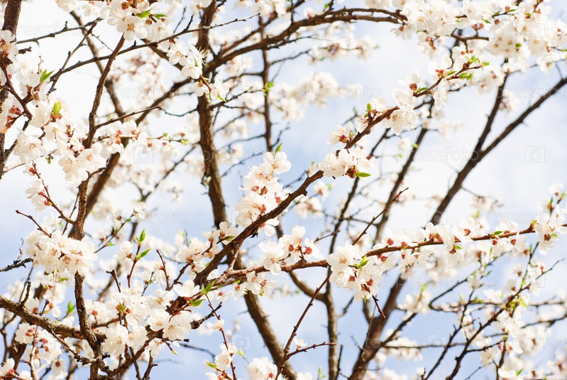 Ветка вишневого дерева в цвету на фоне голубого неба