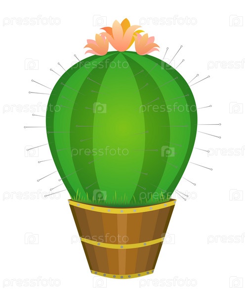 Цветущий зеленый кактус с шипами, посаженный в деревянный горшок