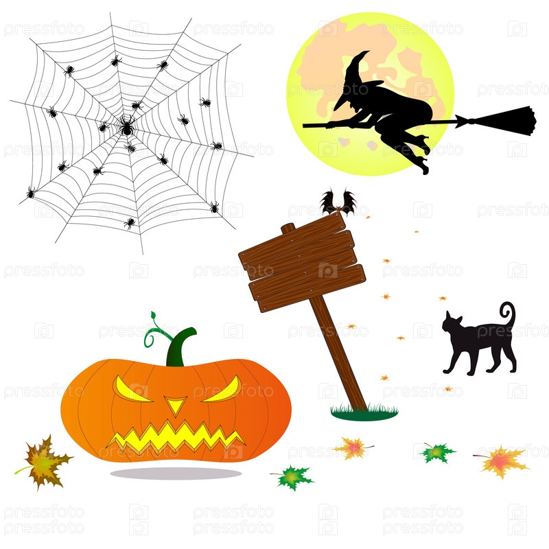 С праздником Хэллоуина. Страшные персонажи ведьма, тыква, летучая мышь, кот и луна