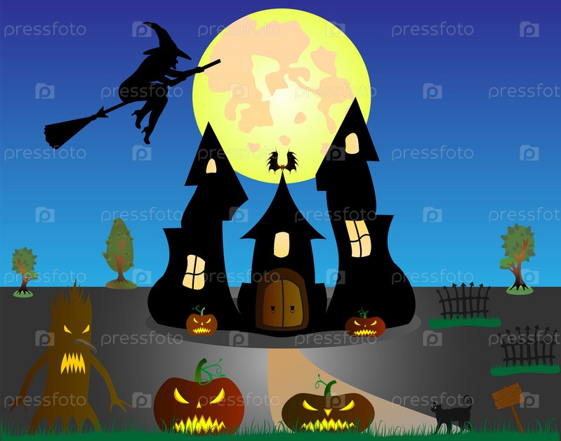 Персонажи праздника Хэллоуин. Черный замок, летающая ведьма, тыквы, кот, деревья. предметы, силуэты