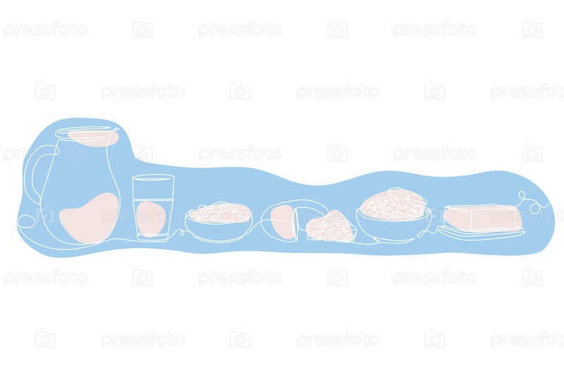 Молочные продукты в стиле непрерывного рисования линий. Молоко, сметана, творог, сыр, масло черный линейный эскиз изолирован на белом фоне. Векторная иллюстрация