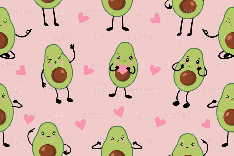 Бесшовный векторный рисунок авокадо в стиле каваи. Модный детский узор для оформления интерьера, плаката, текстиля. Простая векторная иллюстрация с вегетарианской здоровой пищей. Вектор