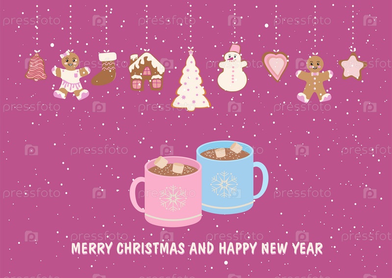 Рождественская открытка с чашками и пряничными человечками. Шаблон поздравительной открытки с Рождеством и Новым годом, плаката, приглашения на вечеринку. Векторная иллюстрация