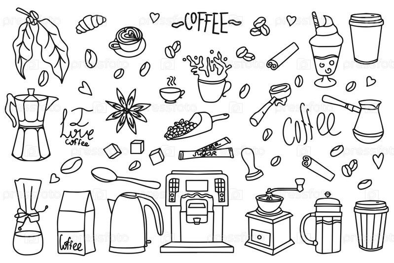 Симпатичные каракули мультяшные иконки кафе. Набор рисованных вручную дизайнов кофе: напитки, закуски и кофейная посуда. Векторный контур рисованной кофе и пекарни для меню кафе