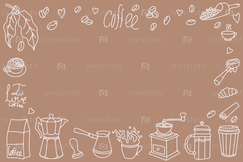 Симпатичные каракули мультяшные иконки кафе. Фон с напитками и кофейной посудой. Векторный контур рисованной кофе и пекарни для меню кафе