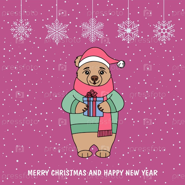 Векторная новогодняя открытка. Милый мишка в новогоднем свитере с подарком в лапках. Рождественская открытка