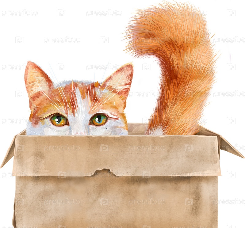 Портрет забавного кота, выглядывающего из коробки. Акварельная иллюстрация