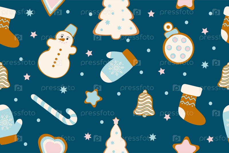 Зимние бесшовные узоры с пряниками. Потрясающий праздничный векторный фон