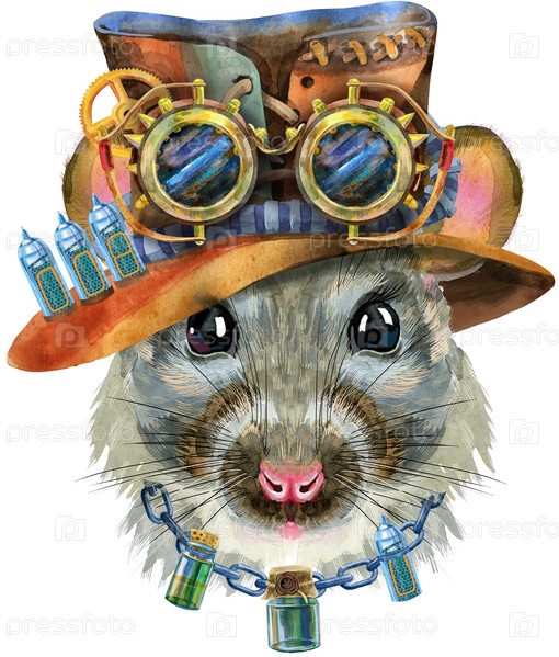 Акварельный портрет крысы в стимпанк-шляпе и очках