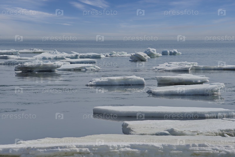 Россия. Западное побережье острова Сахалин. Живописные льдины весеннего Тихого океана.