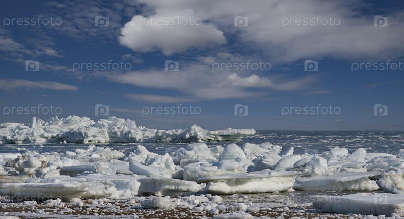 Россия. Западное побережье острова Сахалин. Живописные льдины весеннего Тихого океана.