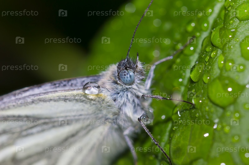 Бабочка на листе в каплях дождя
