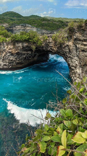 Величественные скалы окружают безмятежную бирюзовую бухту на пляже Брокен на острове Нуса-Пенида