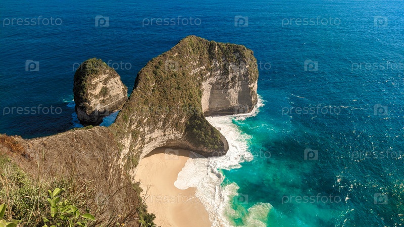 Захватывающий вид на пляж Келингкинг на острове Нуса Пенида. Бирюзовые воды, высокие скалы и золотой песок создают райскую атмосферу