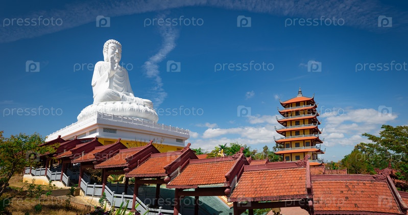 Статуя Будды, окруженная благовониями, в мирной медитации, в храме Чуа Хюэ Тьеу в Контуме, Вьетнам