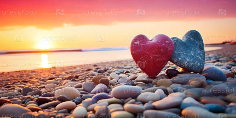 Два камня в форме сердца на галечном пляже, освещенные теплыми цветами заката