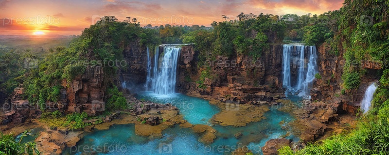 Фантастический пейзаж с водопадом на закате, панорама