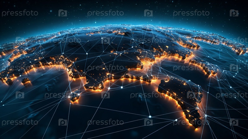 Замысловатая иллюстрация, изображающая глобальное сетевое соединение, представляющее взаимосвязь Интернета по всему миру