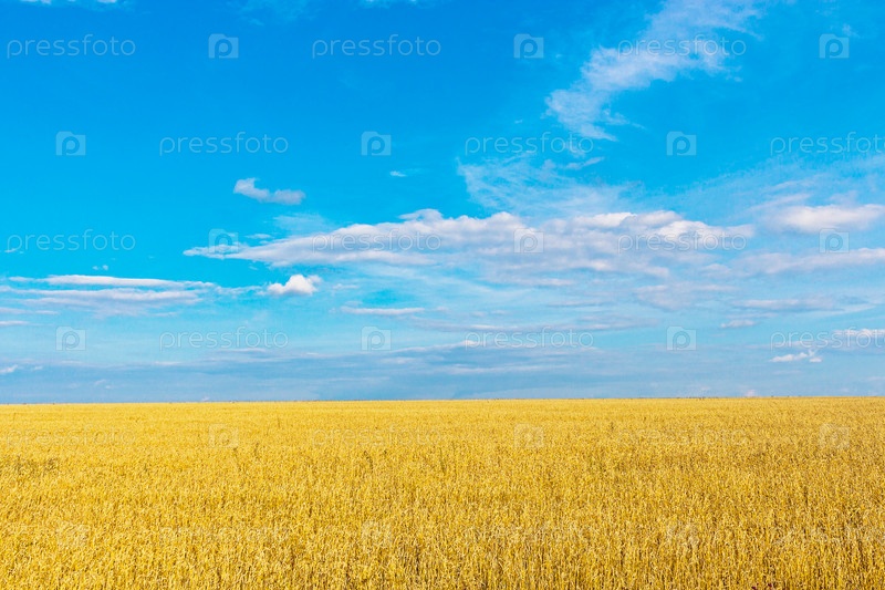 Голубое небо с облаками над желтым пшеничным полем