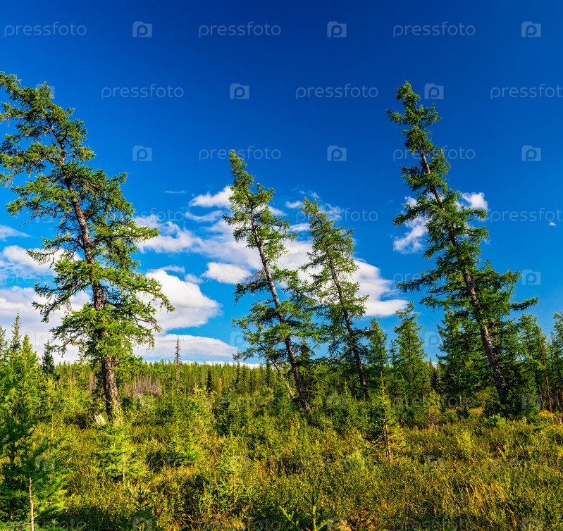 Лежащие лиственницы в лесу в солнечный летний день
