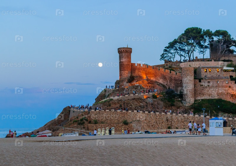 Башня крепости Тосса-де-Мар вечером при луне. Башня зажжена фонарями