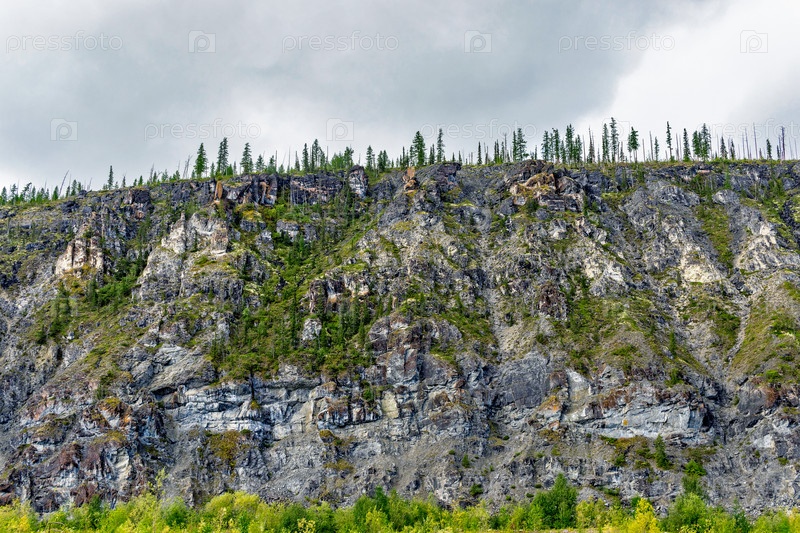 Отвесная скала, поросшая лесом в уральских горах