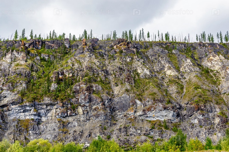 Отвесная скала, поросшая лесом в уральских горах