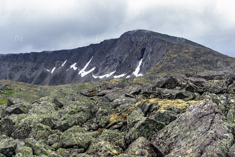 Отвесная серая скала в горах в пасмурный день