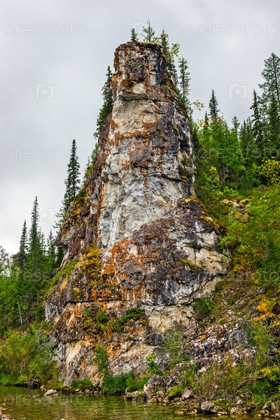 Одинокая скала в лесной зоне на Приполярном Урале в пасмурный летний день
