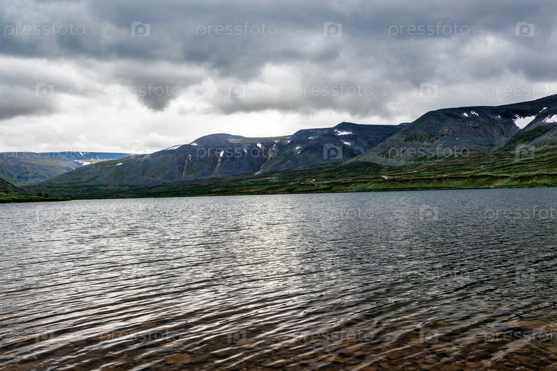 Холодное озеро и горный хребет в дождливый день