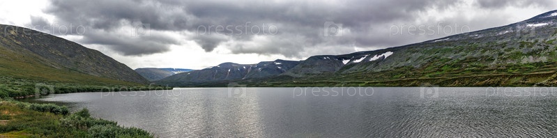 Холодное озеро и горный хребет в дождливый день