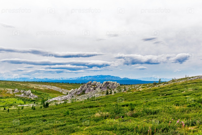 Зеленый луг с грядой серых скал
