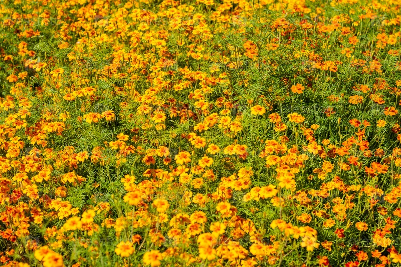 Вельхи род однолетних и многолетних растений семейства астровых. Красивые яркие вельхи цветут на клумбе. Цветы. Маригольдс are a genus of annual and perennial plants of the Asteraceae family. Beautiful bright marigolds are blooming in a flower bed. F