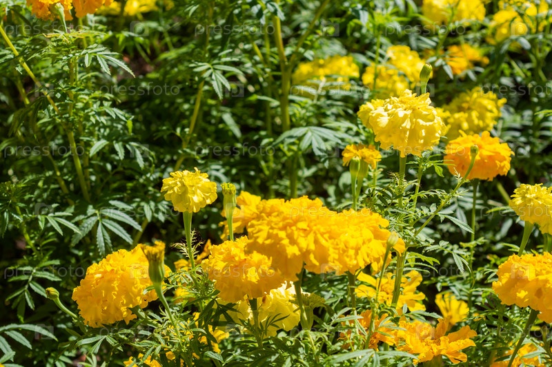 Вельхи род однолетних и многолетних растений семейства астровых. Красивые яркие вельхи цветут на клумбе. Цветы. Маригольдс are a genus of annual and perennial plants of the Asteraceae family. Beautiful bright marigolds are blooming in a flower bed. F