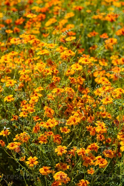 Вельхи род однолетних и многолетних растений семейства астровых. Красивые яркие вельхи цветут на клумбе. Цветы. Маригольдс are a genus of annual and perennial plants of the Asteraceae family. Beautiful bright marigolds are blooming in a flower bed. F