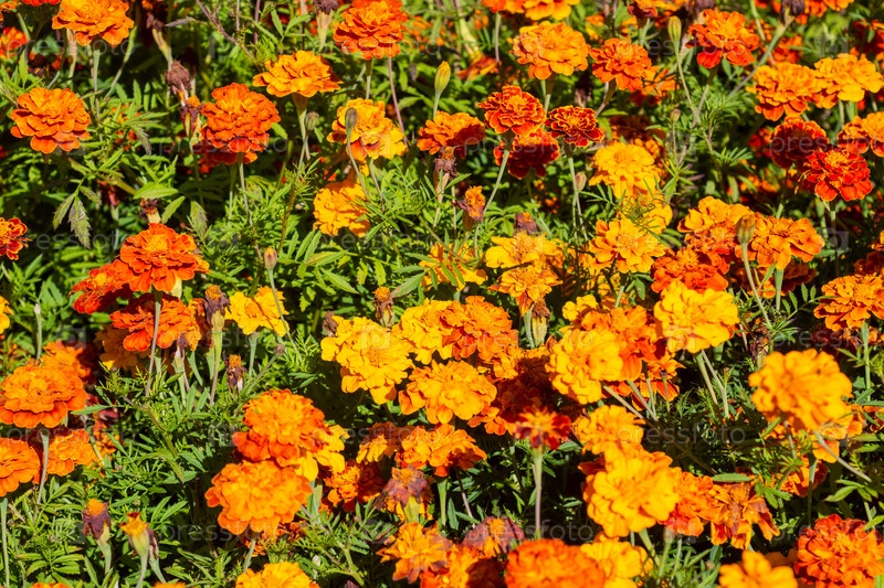 Вельхи род однолетних и многолетних растений семейства астровых. Красивые яркие вельхи цветут на клумбе. Цветы. Маригольдс are a genus of annual and perennial plants of the Asteraceae family. Beautiful bright marigolds are blooming in a flower bed. F