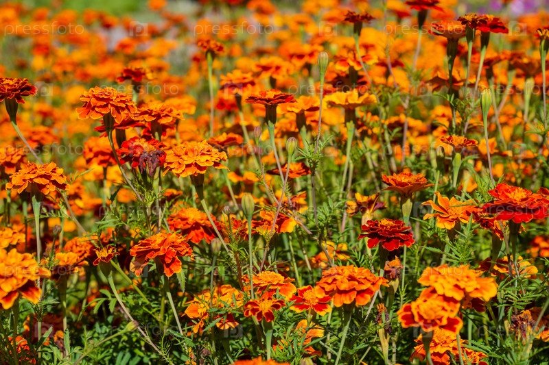 Вельхи род однолетних и многолетних растений семейства астровых. Красивые яркие вельхи цветут на клумбе. Цветы. Маригольдс are a genus of annual and perennial plants of the Asteraceae family. Beautiful bright marigolds are blooming in a flower bed. F