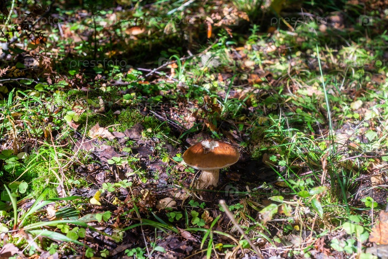 Белый гриб вырос в лесу. Представитель рода боровики семейства болезненный класс агарикомицеты. Съедобные грибы. Белый гриб вырос в лесу. Представитель рода boletus из семьи Bolete класса agaricomycetes. Естный гриб