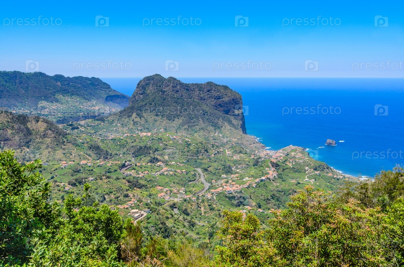 Красивый пейзаж Порту-да-Крус на деревьях переднего плана. Остров Мадейра, Португалия
