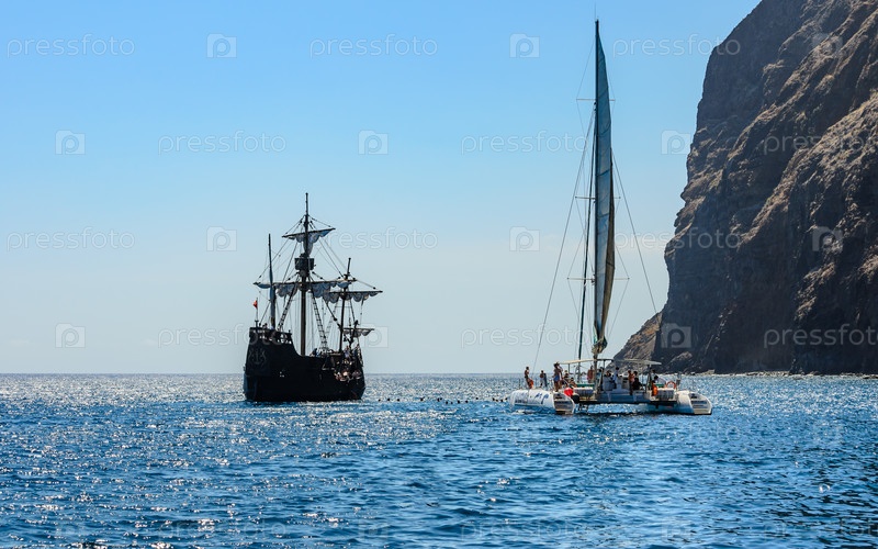 Копия исторического корабля Христофора Колумба Санта-Мария и прогулочный катамаран у берегов Мадейры. Португалия